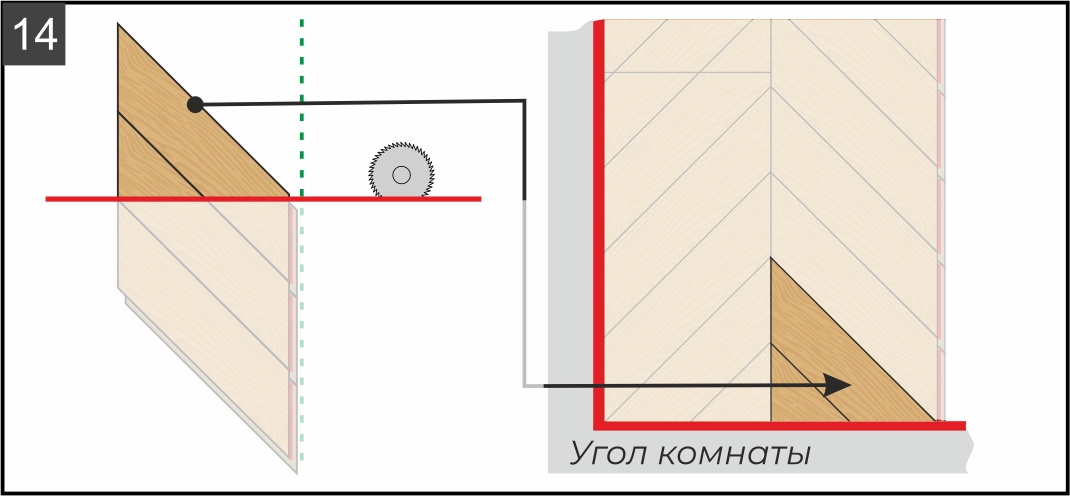 9.2. Отрежьте край ряда по указанной на рисунке красной линии (она формируется в зависимости от левого угла комнаты). Исходя из расчетов (см. рисунок 5) при необходимости подрежьте плашки по длине. В зависимости от типа пилы, которую вы используете, разберите плашки и отпилите каждую по отдельности или сделайте это уже в сборке, предварительно наметив линию при помощи угольника и карандаша.