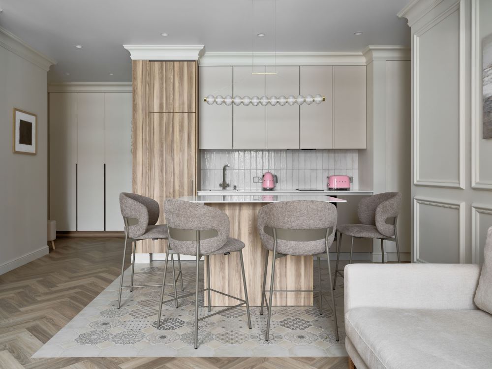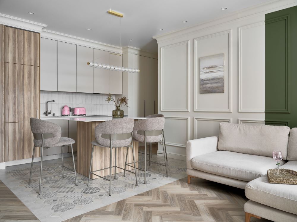 Классика этого интерьера читается в деталях — филёнках на стенах, широких карнизах и спокойной симметрии. Пространство звучит современно и легко, как продуманная композиция без лишних нот. Акцентная стена в цвете хаки добавляет интерьеру глубину и гармонично объединяется с тёплым деревом в отделке.